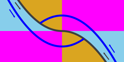 The light-blue regions are perhaps the worst. In these regions the spacecraft is moving too quickly towards the target, and the fixed acceleration won't be enough to bring it to a stop before overshooting the target. So from here, the spacecraft has no choice but to overshoot and cross from a light blue region into the neighboring magenta region, on the opposite side of the target. With that unpleasantnes behind it, the spacecraft can follow the magental plan above, and make its way to the neighboring golden retion to complete the hoverslam.