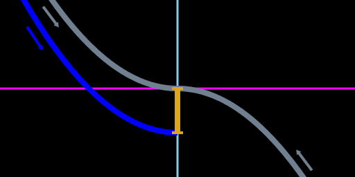 State space of displacement (vertical axis, light blue) vs velocity (horizontal axis, magenta) and complete hoverslam curve